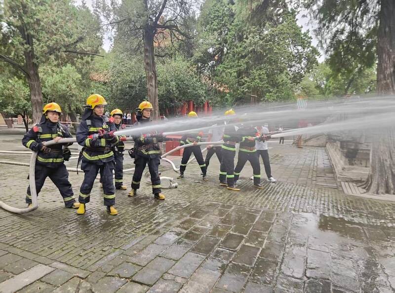 演练正式拉开帷幕。此次演练模拟孔庙景区大成殿东北侧突发火情,设置“发现火情、初期处置、联合救援、人员疏散、现场警戒”全流程实战场景,重点检验多部门协同作战能力,确保覆盖应急处置各关键环节。
