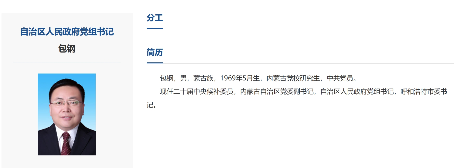 内蒙古自治区人民政府网更新后显示,包钢已任内蒙古自治区党委副书记,自治区人民政府党组书记。包钢,男,蒙古族,1969年5月生,内蒙古党校研究生,中共党员。现任二十届中央候补委员,内蒙古自治区党委副书记,自治区人民政府党组书记,呼和浩特市委书记。