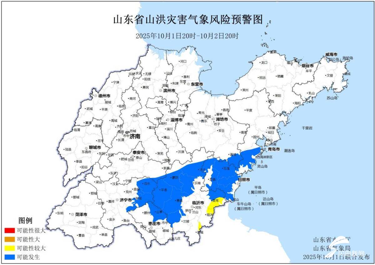 预计10月1日20时至10月2日20时,临沂市局部地区发生山洪灾害的可能性较大(黄色预警),青岛、枣庄、潍坊、济宁、泰安、日照、临沂等市局部地区可能发生山洪灾害(蓝色预警)。