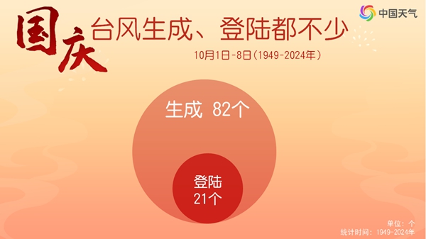 国庆假期有台风来袭其实并不算少见。盘点1949年至2024年台风大数据发现,历年国庆期间(10月1日至8日),共有82个台风生成,其中登陆我国的台风有21个,平均3至4年就有一个台风在国庆期间登陆。