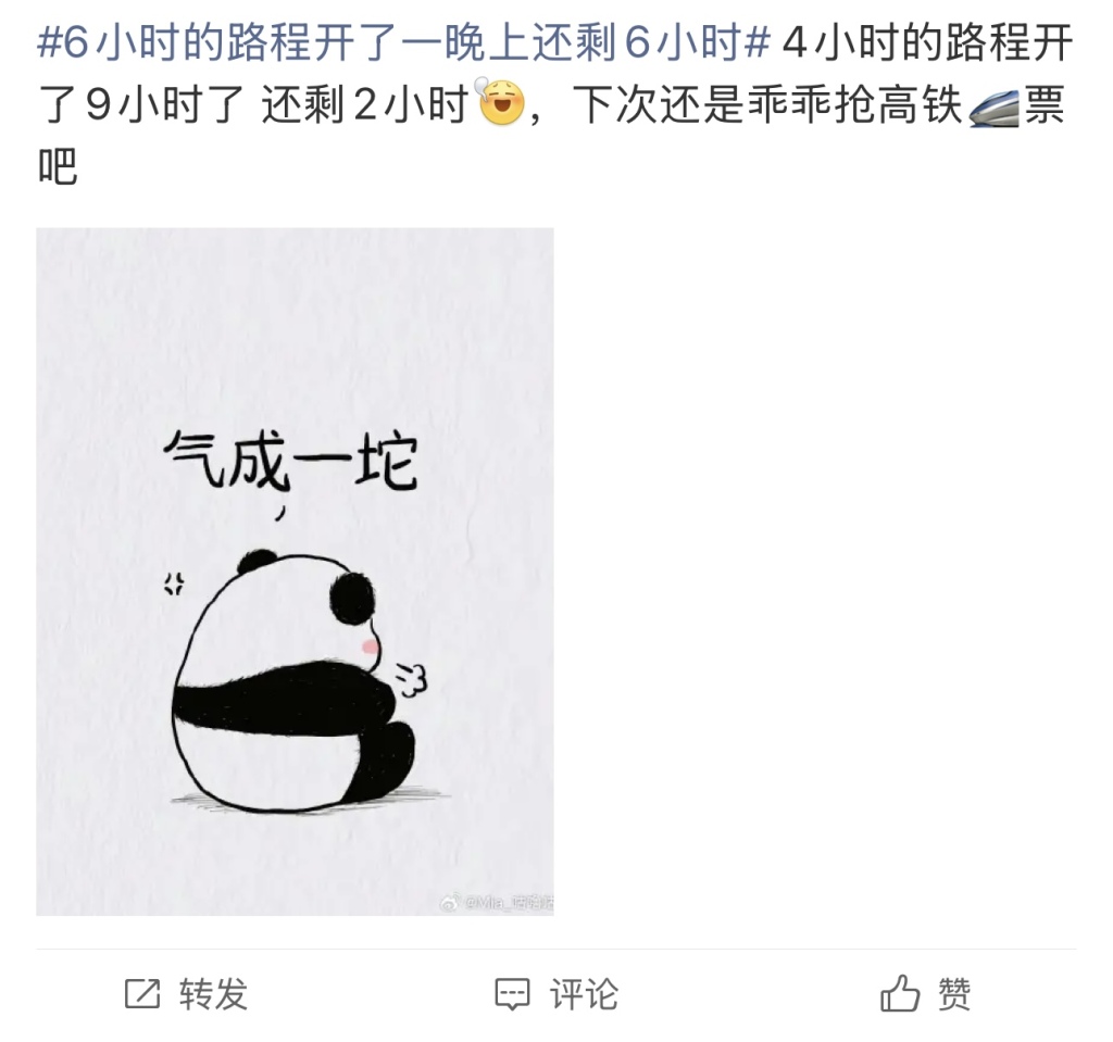 还有网友表示:“所以我今天凌晨三点就出发了。”“4小时的路程开了9小时了,还剩2小时,下次还是乖乖抢高铁票吧。”