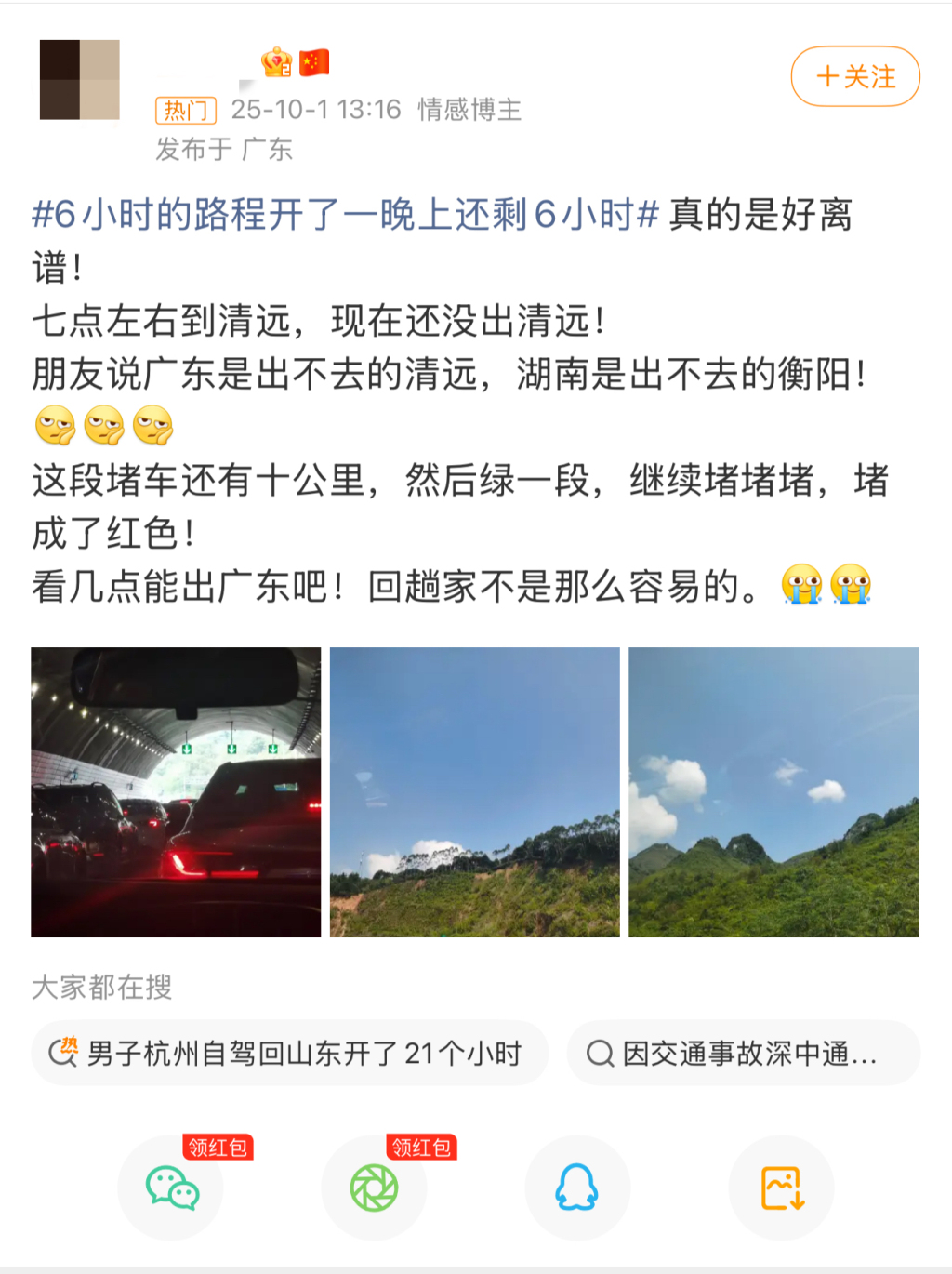 当日“6小时的路程开了一晚上还剩6小时”的词条冲上热搜,不少游客表示堵车严重:“不行了,出去玩的我真的要崩溃了,实在是太堵了,高速堵车,高铁堵人,实在是太多人了。”“七点左右到清远,现在(13:16)还没出清远!”