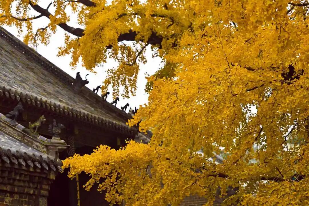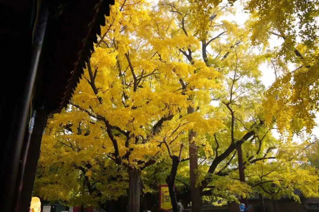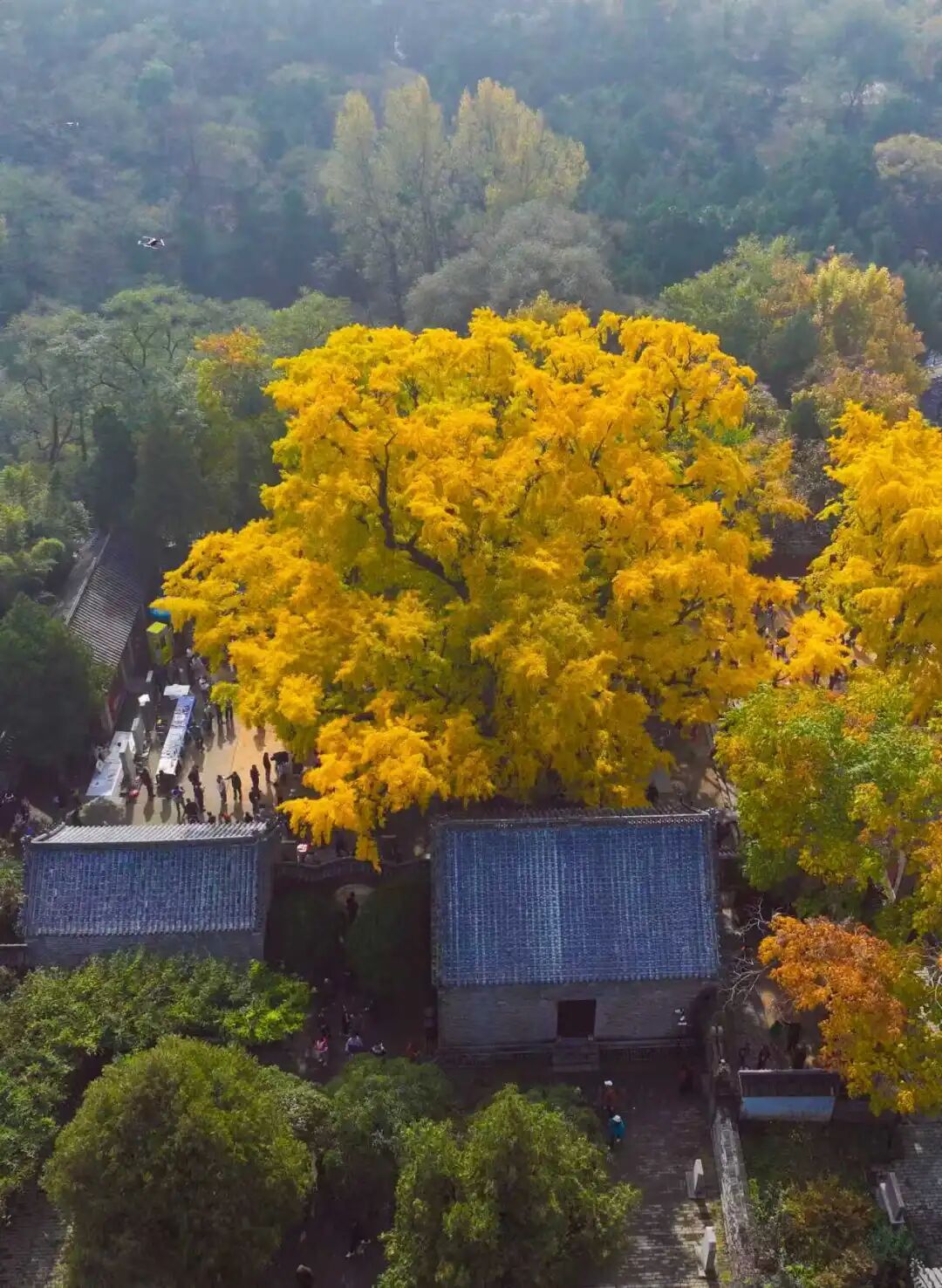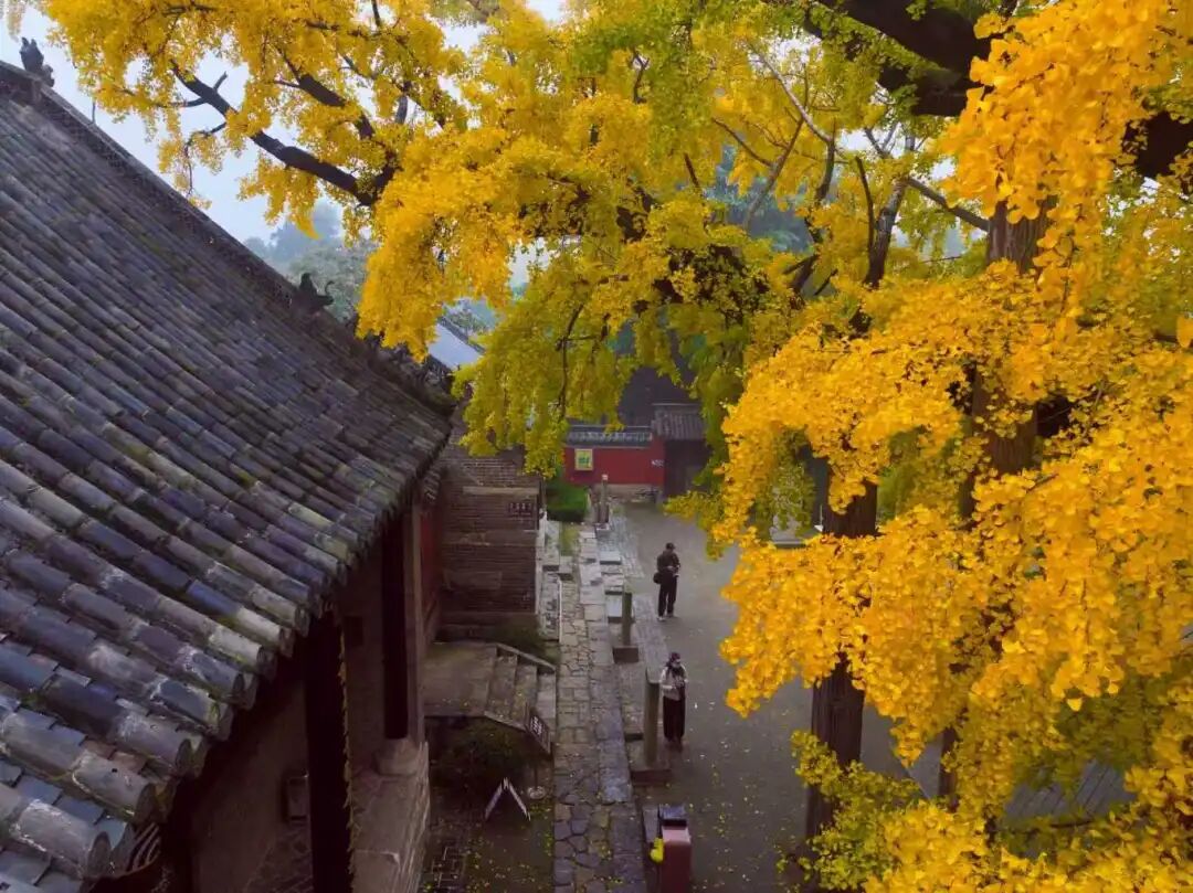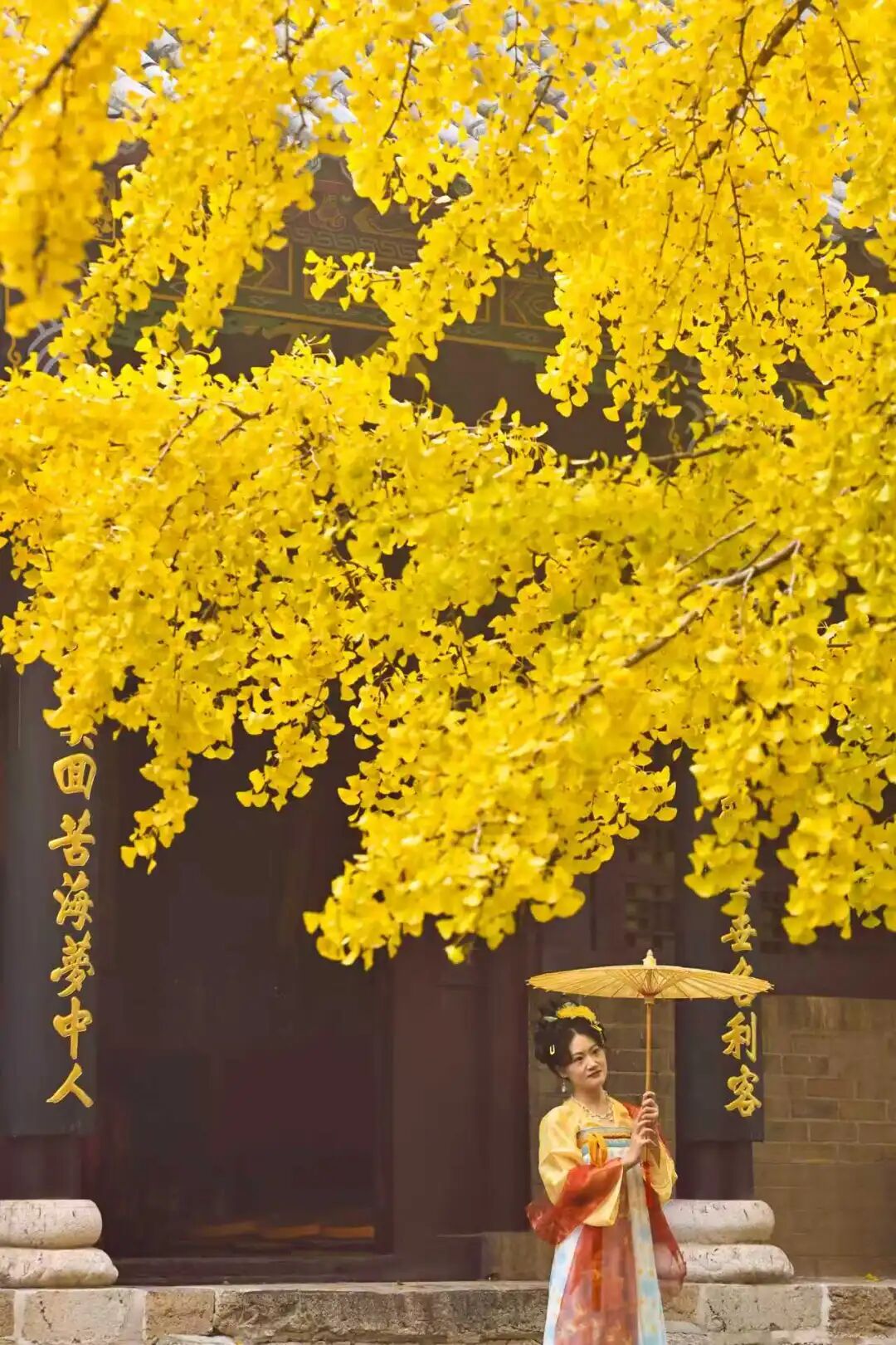 巨大的树冠如一把金色的巨伞,笼罩着古老的定林寺。风起时,万千金叶翩跹而下,古寺的庭院瞬间铺上一层“黄金地毯”,景色尤为震撼。
