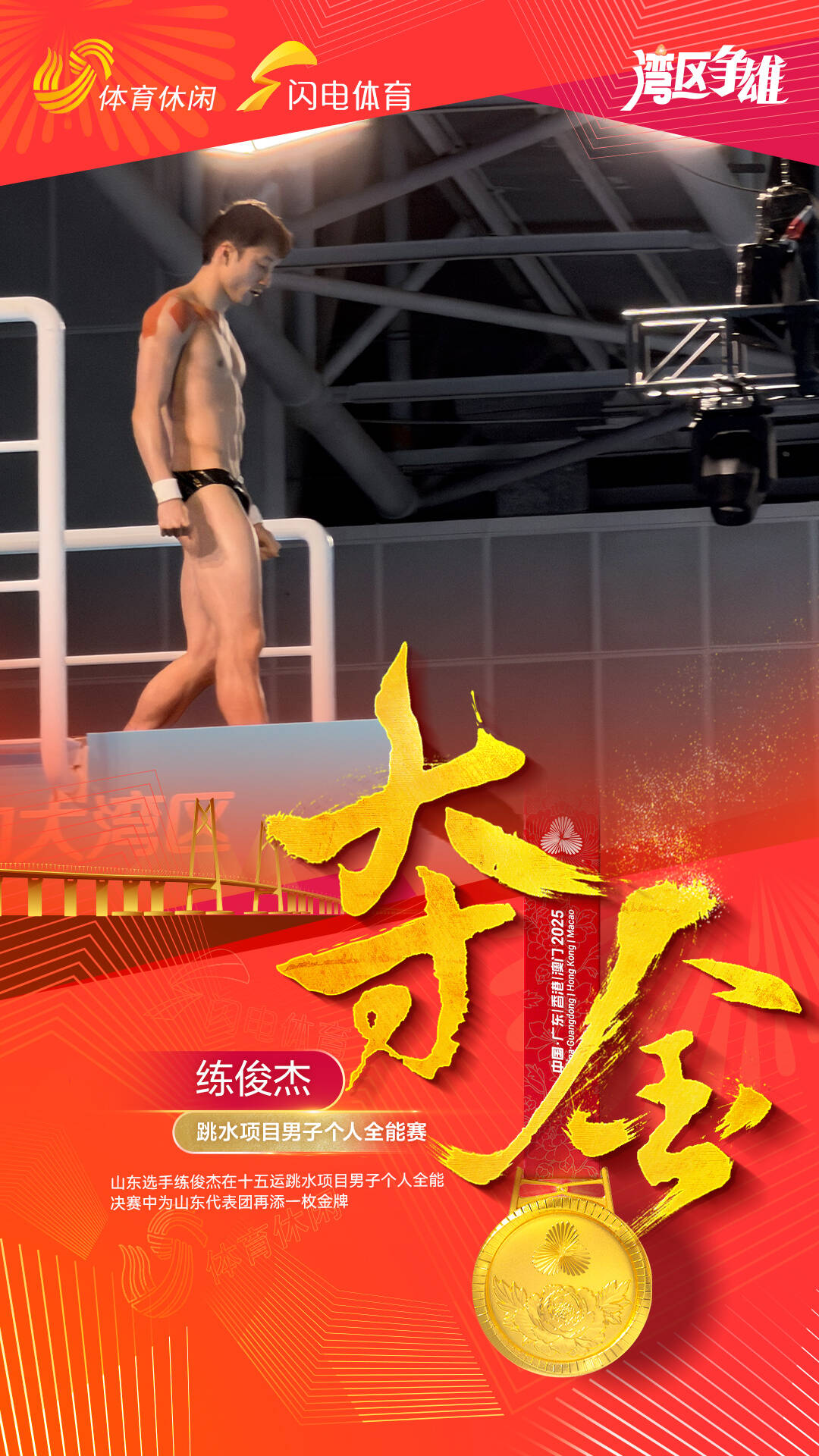 闪电体育11月5日讯 今天,在第十五届全国运动会跳水项目男子个人全能决赛中,练俊杰为山东体育代表团斩获一枚金牌,这也是他在本届全运会上获得的第二枚奖牌。