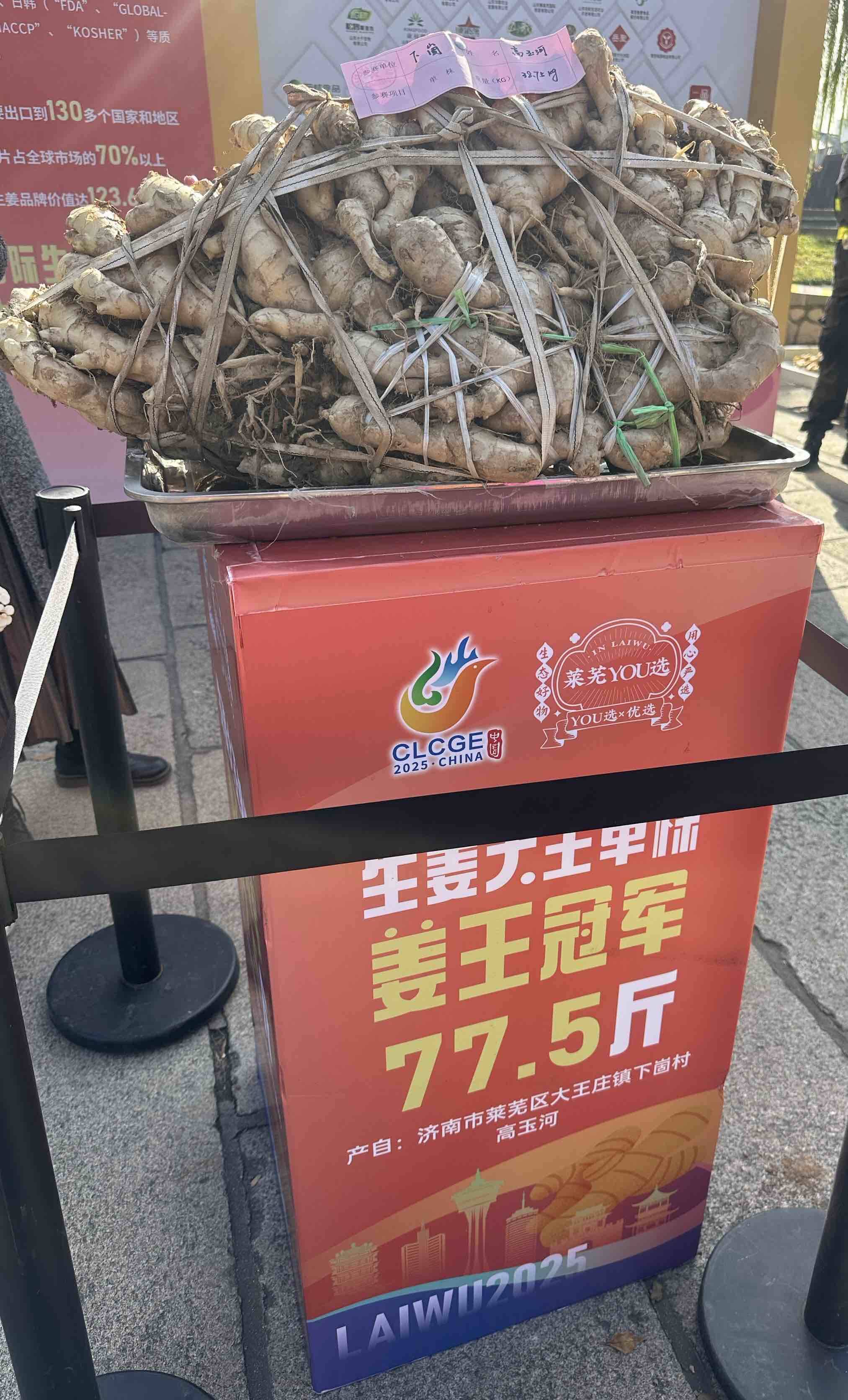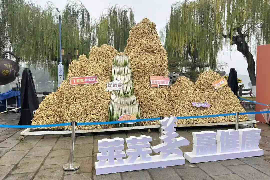 现场,莱芜大王庄镇“生姜大王”比赛中夺冠的“姜王”展品,饱满的根茎、惊人的重量吸引市民纷纷驻足拍照,“第一次见到这么大的生姜,不愧是‘姜中之王’,必须和它合个影!”济南市民王女士举着手机记录。姜王的诞生离不开科技赋能与标准化种植。据悉,莱芜生姜种植依托脱毒种苗培育、精准水肥管理等现代农业技术,既保留了“皮薄丝少、辣浓味美”的传统特质,又实现了产量质的飞跃。目前,莱芜区已建立生姜种质资源库和脱毒种苗研发繁育中心,年产脱毒试管苗3000万株,带动生姜单产提升50%以上,为“姜王”的培育奠定了坚实基础。另外,用数千斤生姜堆叠而成的“姜山”景观同样人气爆棚,成为市集标志性打卡点,游客们穿梭其间,感受着莱芜生姜产业的蓬勃气场。