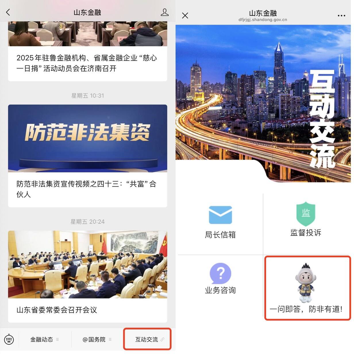 关注“山东金融”微信公众号,点击“互动交流”,点击“一问即答,防非有道”。