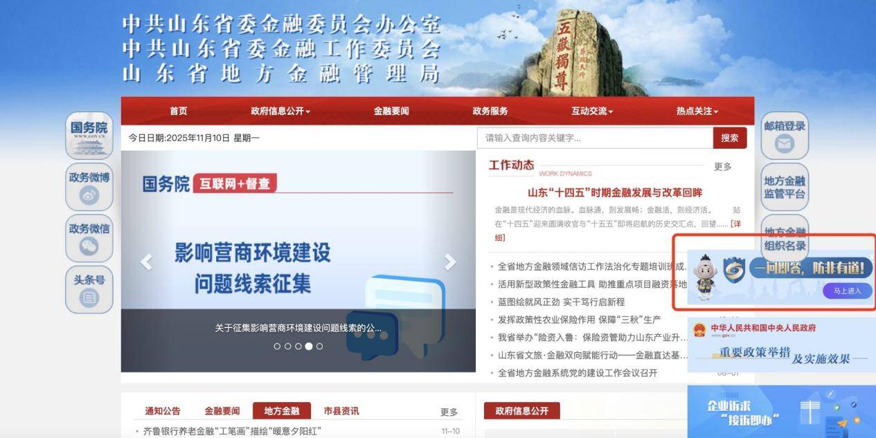 登录“中共山东省委金融委员会办公室”官方网站,点击右下角的第一个浮窗。