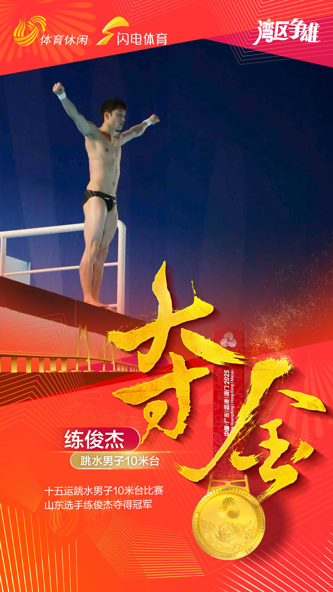 闪电体育11月11日讯 今天19:30,十五运会跳水男子10米跳台迎来决赛,山东选手练俊杰发挥稳定,最终拿下金牌。