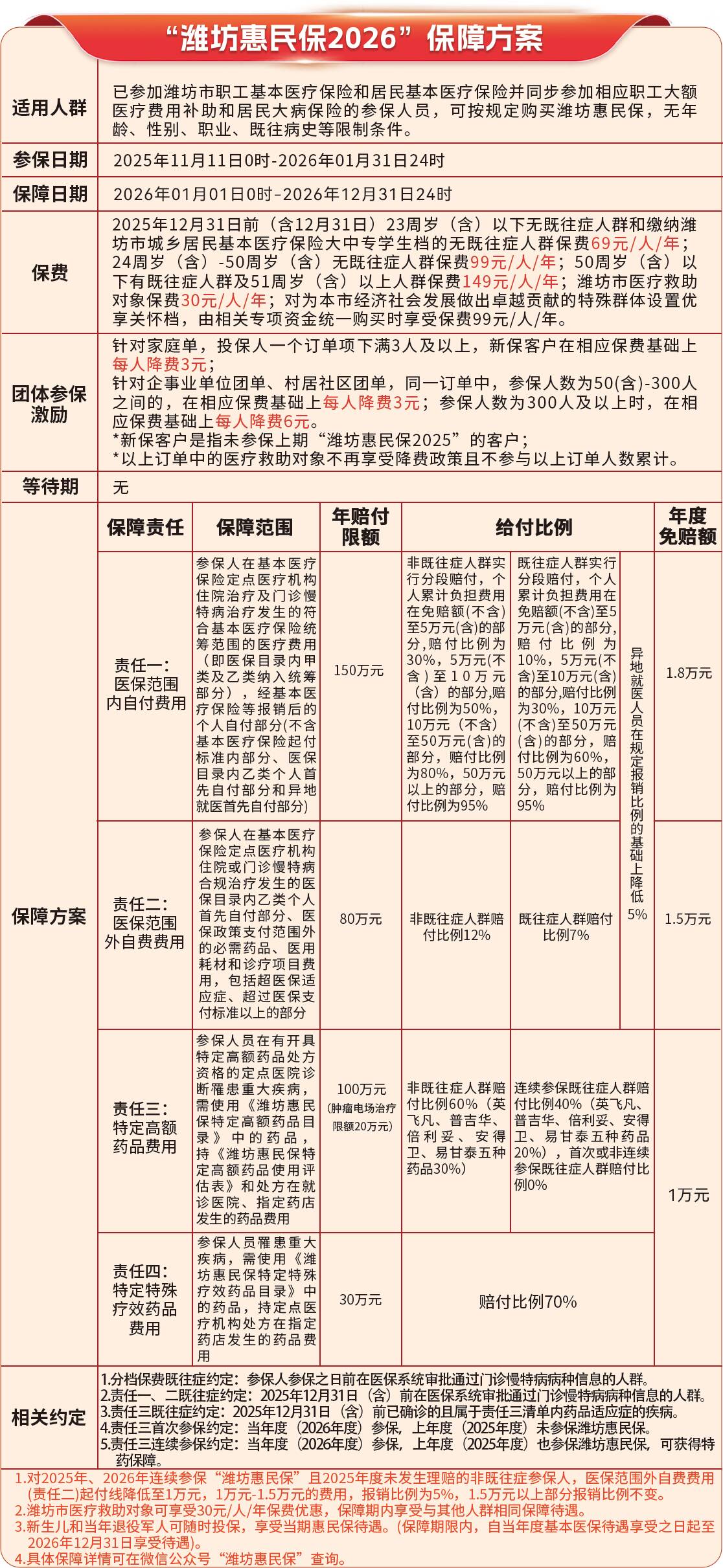 “潍坊惠民保2026”涵盖医保范围内自付费用、医保范围外自费费用、特定高额药品费用、特定特殊疗效药品费用四大保障,今年,“潍坊惠民保2026”实现五大维度全新升级,不仅紧密贴合群众日常的健康保障需求,还特别强化了对于重大疾病的预防与保障力度,既体现了对全民健康的广泛覆盖,又深入关怀到了特殊群体的特殊需求。