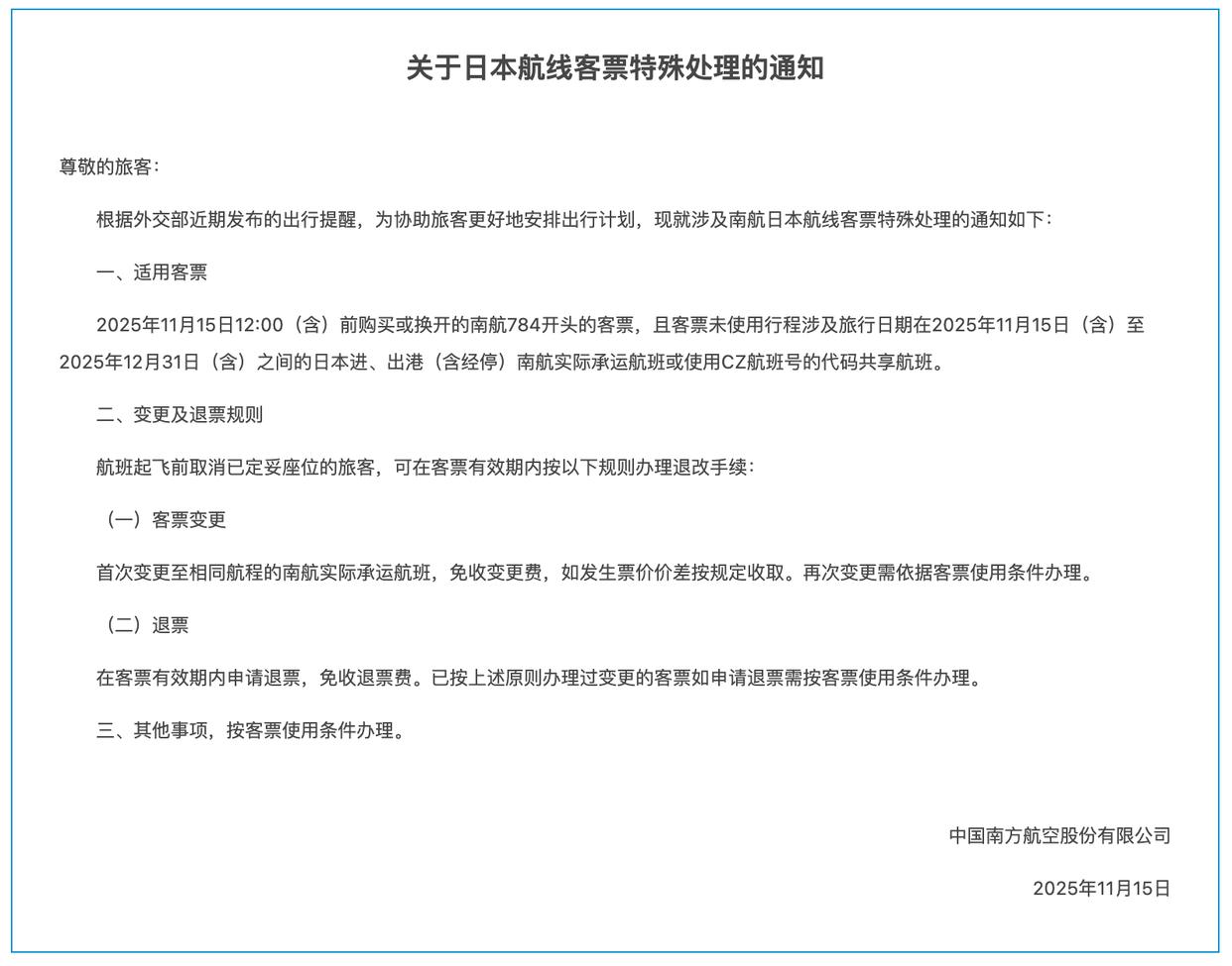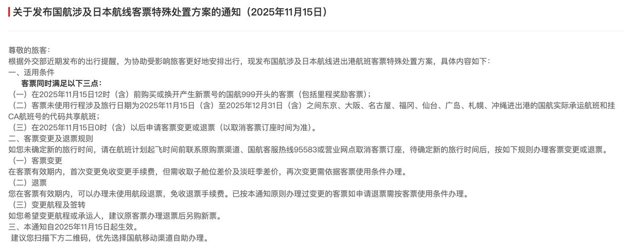东航表示,为协助行程涉及日本航线的旅客更好地安排出行,现发布东航涉及日本航线进出港航班客票特殊处置方案,凡客票中至少含有一段未使用的涉及日本(包括但不限于东京、大阪、广岛、札幌、小松、鹿儿岛、长崎、新泻、冈山、福冈、静冈、名古屋、松山、冲绳、富山、熊本)进港、出港或经停航班(包括东航、上航或其他航空公司航班),航班起飞日期在2025年11月15日至2025年12月31日期间的,可免费变更一次,退票则免收退票手续费。