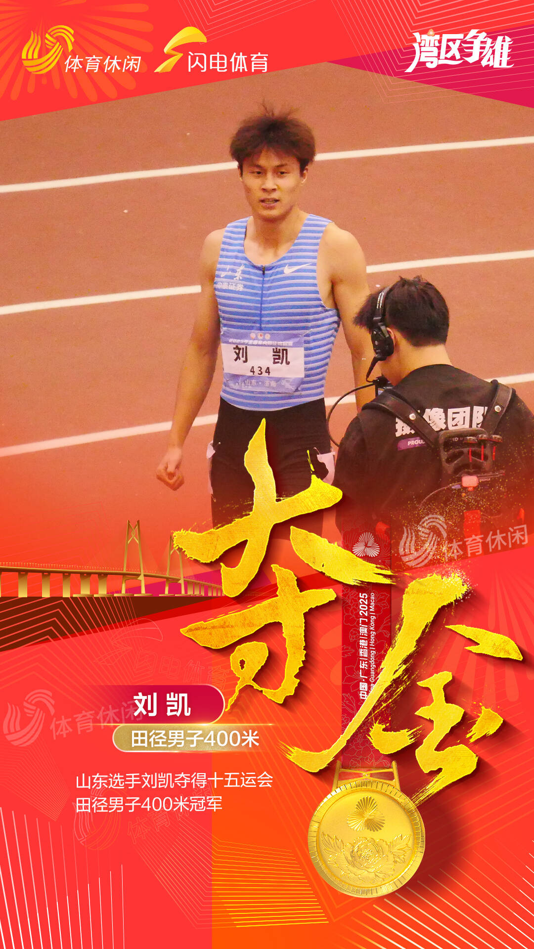 今天,十五运会田径男子400米决赛举行,最终,山东队刘凯夺得冠军。