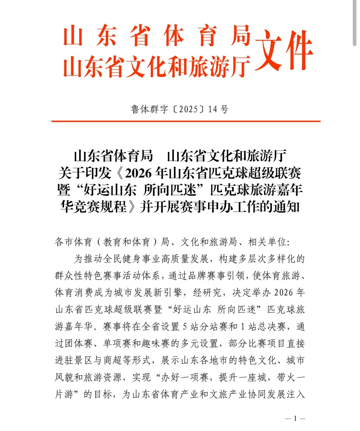 近日,山东省体育局、山东省文化和旅游厅联合发布《关于印发<2026年山东省匹克球超级联赛暨“好运山东所向匹迷”匹克球旅游嘉年华竞赛规程>并开展赛事申办工作的通知》,内容如下: