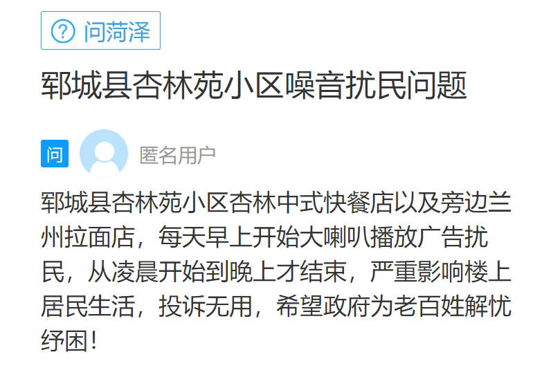 齐鲁网·闪电新闻11月22日讯 菏泽的一位网友在闪电新闻网络问政平台留言:在郓城县杏林苑小区,杏林中式快餐店以及旁边兰州拉面店,每天早上开始大喇叭播放广告扰民,严重影响楼上居民生活。希望政府为老百姓解忧纾困。