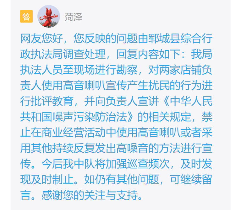 收到留言后,郓城县综合行政执法局进行了办理并回复:执法人员至现场进行勘察,对两家店铺负责人使用高音喇叭宣传产生扰民的行为进行批评教育,并向负责人宣讲《中华人民共和国噪声污染防治法》的相关规定,禁止在商业经营活动中使用高音喇叭或者采用其他持续反复发出高噪音的方法进行宣传。今后执法人员将加强巡查频次,及时发现及时制止。