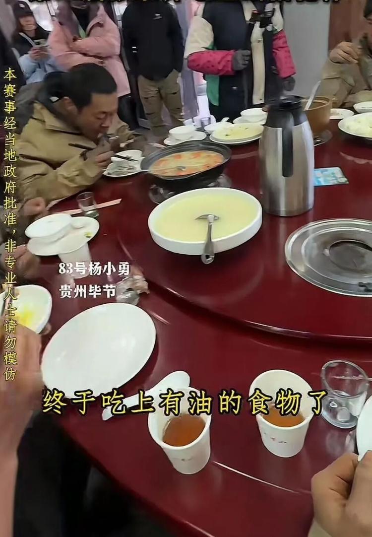 选手们下山后吃粥、喝汤。图/承办方“老六荒野”视频截图