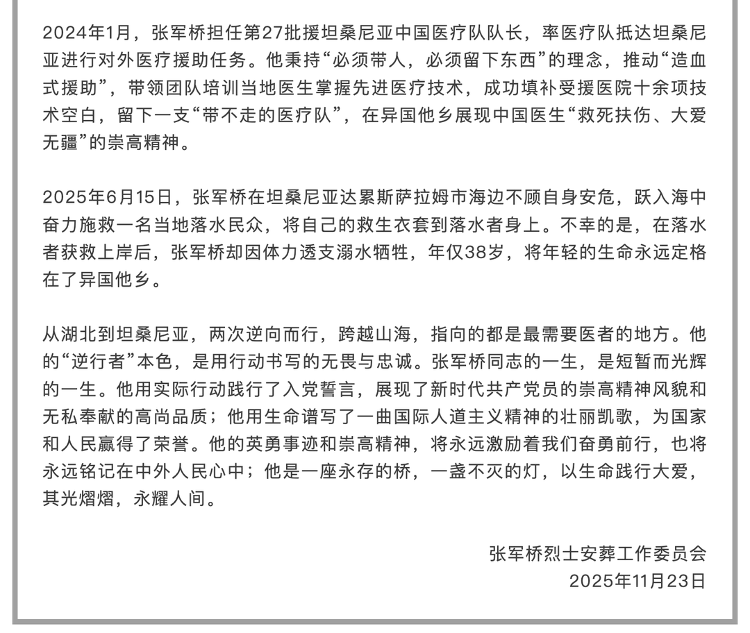 2025年6月15日,张军桥在坦桑尼亚达累斯萨拉姆市海边不顾自身安危,跃入海中奋力施救一名当地落水民众,将自己的救生衣套到落水者身上。不幸的是,在落水者获救上岸后,张军桥却因体力透支溺水牺牲,年仅38岁,将年轻的生命永远定格在了异国他乡。