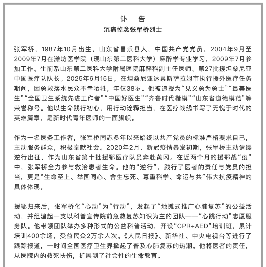 张军桥,1987年10月出生,山东省昌乐县人,中国共产党党员,2004年9月至2009年7月在潍坊医学院(现山东第二医科大学)麻醉学专业学习,2009年7月参加工作。生前系山东第二医科大学附属医院麻醉科副主任医师、第27批援坦桑尼亚中国医疗队队长。2025年6月15日,在坦桑尼亚达累斯萨拉姆市执行援外医疗任务期间,因勇救落水民众不幸牺牲,年仅38岁。他被追授为“见义勇为勇士”“最美医生”“全国卫生系统先进工作者”“中国好医生”“齐鲁时代楷模”“山东省道德模范”等荣誉称号。他以生命践行初心,用行动诠释担当,在医疗战线书写了无愧于时代的英雄篇章,是新时代青年医师的一面旗帜。