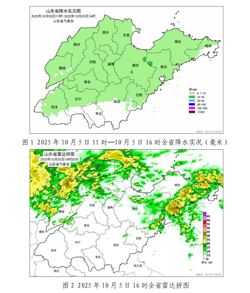 各市平均降水量:潍坊5.3、青岛 3.7、泰安3.5、淄博3.0、东营 2.5、德州2.2、滨州 2.1、烟台 2.1、济南1.7、日照1.1、济宁1.0和临沂1.0,其他市降水量不足1.0或无降水。县(市、区)平均降水量超过5.0的10个,1.0-5.0的64个,前3位的是:潍坊安丘7.4、泰安新泰6.6和潍坊昌乐6.4。所有站点超过10.0的6个,5.0-10.0的209个,1.0-5.0的1046个,降水量前3位的是:青岛平度崔家集18.9、泰安新泰东高平水库15.7(水文站)和潍坊昌邑宋庄15.6。目前,降水回波主要位于聊城、德州、济南、滨州、东营、潍坊、青岛、烟台和威海(图 2)。