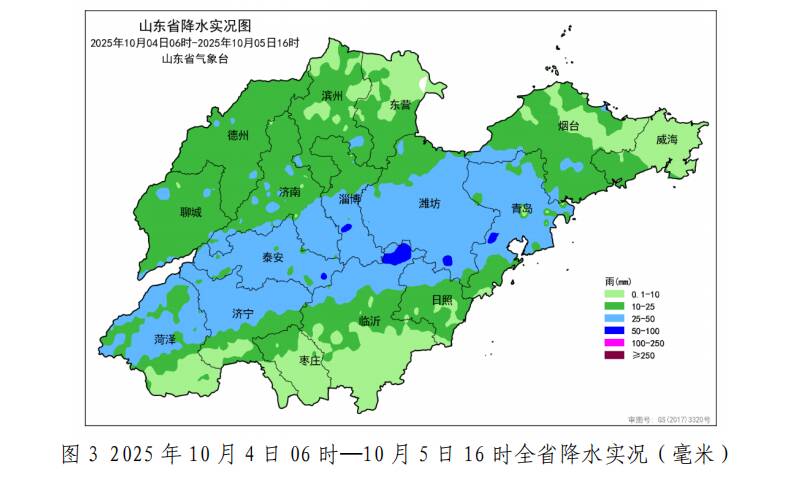 10月4日06时至6日06时,全省普遍出现降水,平均降水量39.2,折合水量约61.5亿方(图3)。各市平均:潍坊60.2、淄博59.1、德州53.2、济南49.3、滨州49.1、东营44.2、青岛43.6、泰安43.5、聊城40.7、烟台37.2、济宁 31.8、菏泽26.7、威海22.0、日照18.2、临沂17.0和枣庄7.6。县(市、区)平均降水量超过50.0的39个,25.0-50.0的57个,10.0-25.0的16个,前3位的是:淄博临淄64.0、潍坊寿光63.9和聊城高唐63.9。所有站点超过100.0的2个,50.0-100.0的683个,25.0-50.0的971个,降水量前3位的是:德州李船头106.0、潍坊青州邵庄103.4和烟台蓬莱97.0(水文站)。