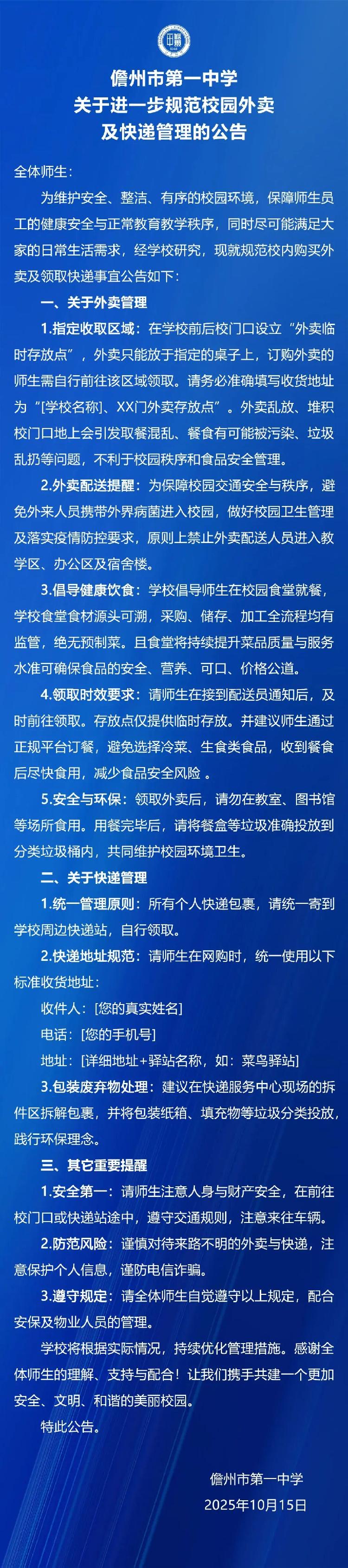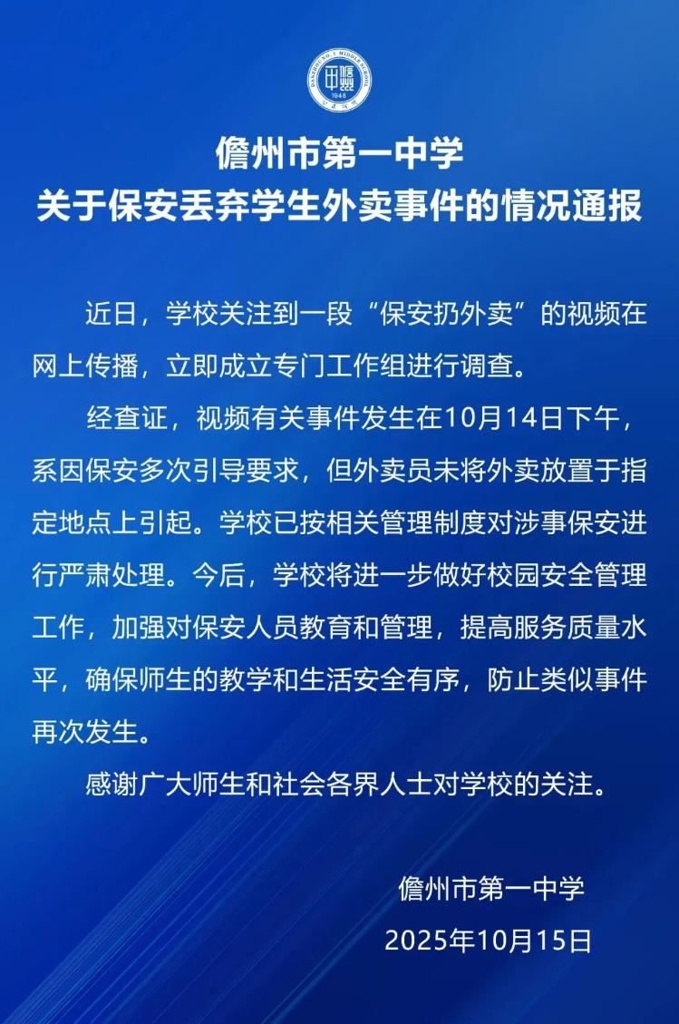 海南儋州一中回应“保安丢弃学生外卖”:系外卖未被放置指定地点