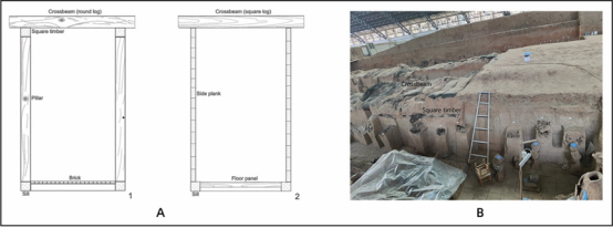 △陪葬坑过洞主要木质框架结构示意图(A1:兵马俑坑;A2:K9901及K9801;B:兵马俑一号坑内炭化木质建筑结构)