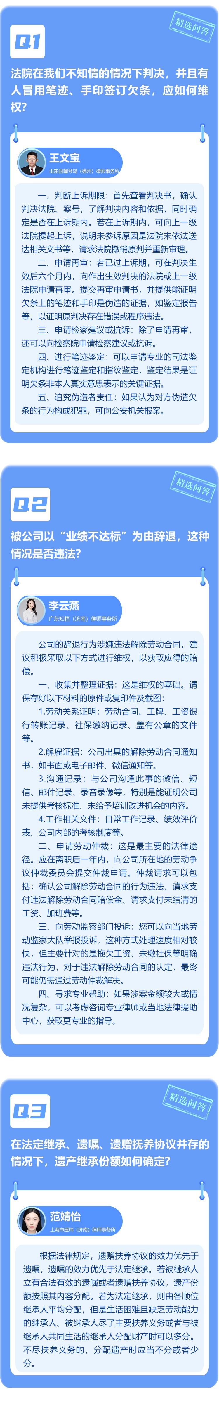 被公司以“业绩不达标”为由辞退,但公司未提供明确考核标准和培训改进机会,这种情况属于违法解除劳动合同吗?法院在我们不知情的情况下判决,并且有人冒用我们笔迹、手印签订欠条,如何维权?遗产继承份额如何确定?一起来看“闪电律师团”本周精选问答!