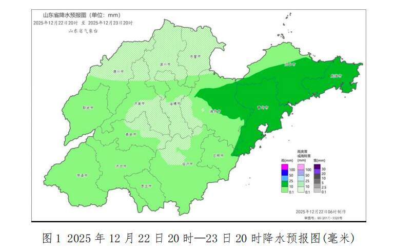 齐鲁网·闪电新闻12月22日讯 山东省气象局11时00分发布雨雪和降温预报:受冷空气和暖湿气流共同影响,预计22日夜间到23日白天,我省自西向东将有一次大范围雨雪天气过程,其中鲁西北和鲁中山区有小雨转雨夹雪或小雪(2~5毫米),潍坊和半岛地区有小到中雨(8~15毫米),其他地区有小雨(3~8毫米),全省累积平均降水量5~8毫米(图1)。