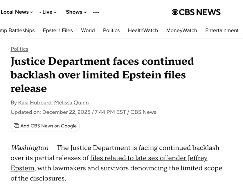 △美国哥伦比亚广播公司报道,司法部因未能完全公布爱泼斯坦档案而遭到强烈批评。