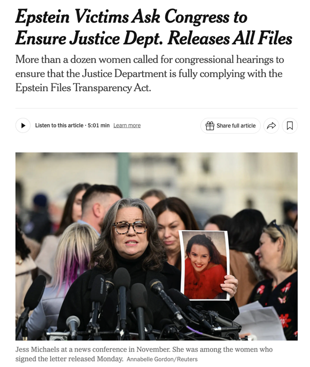 △《纽约时报》报道,爱泼斯坦案受害者要求司法部公布全部文件。