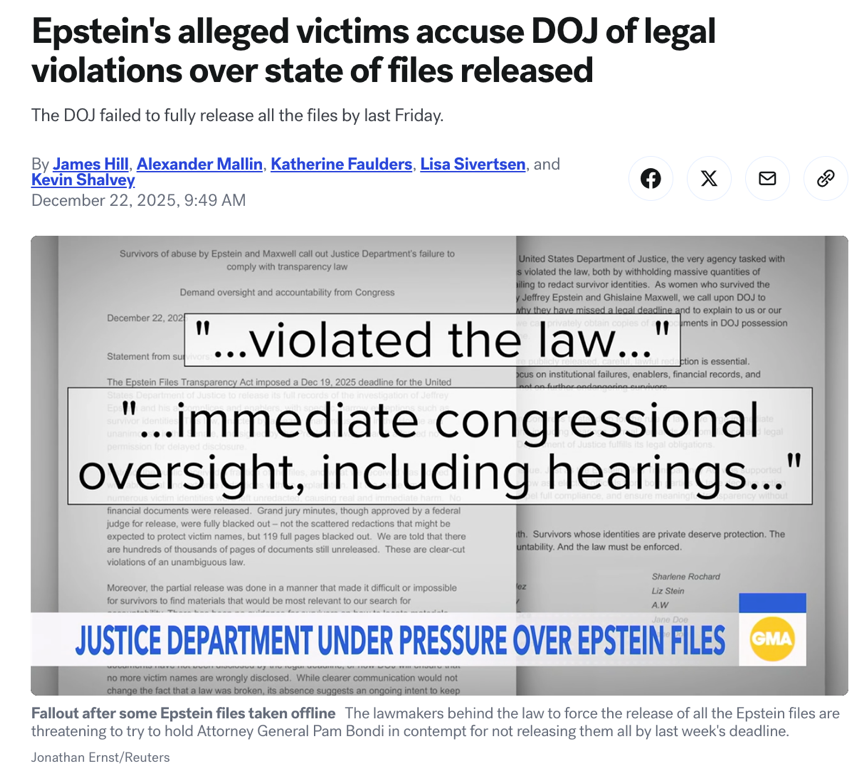 然而在执行层面,到12月19日法定期限时,司法部只公布了部分材料,并明确承认无法按时全部公布,理由是“逐页审查、保护受害者隐私”耗时太长,这被两党议员以及部分受害者代表视为违反法律明文要求。