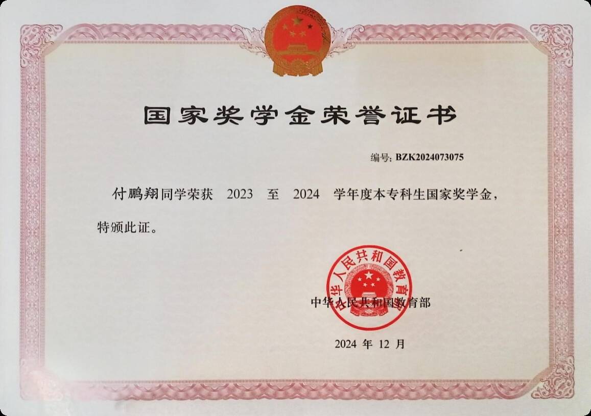 付鹏翔始终以坚韧与自立书写自己的青春篇章。从家庭经济拮据的现实出发,他没有被困难击倒,而是以实际行动承担起生活责任:通过校内兼职、家教辅导,磨练意志实现自我成长;通过学术科研,探索前沿领域,取得丰硕成果;通过学生工作和社会实践,不断服务同学和社会。付鹏翔的经历充分证明,出身从不是局限,唯有奋斗才能改变命运。他将个人理想与国家发展紧密结合,为社会贡献智慧与力量。