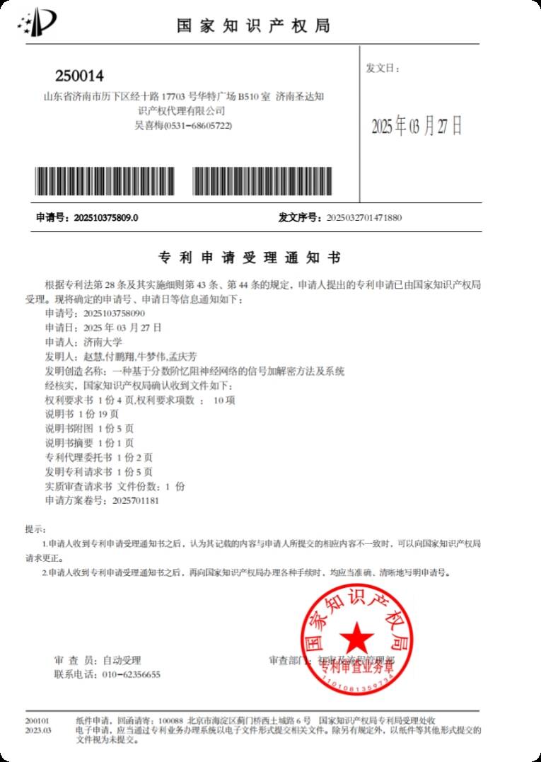 在获得基础保障的同时,付鹏翔充分利用学院提供的学习资源、竞赛平台和科研条件,刻苦钻研,成绩优异。本科阶段已主持国家级大学生创新创业训练计划项目,从项目构思、团队组建到实验推进,展现出不凡的创新思维与实践能力。最终,项目以学术论文结项,并申请两项国家发明专利(均已进入实审阶段)和一项实用新型专利。在校期间获国家奖学金、济南大学一等奖学金,以及济南大学社会工作先进个人、济南大学优秀学生等荣誉称号,现已保研至上海科技大学攻读硕士研究生。未来,他将在计算机与医学的交叉领域继续探索,用自己所学的智能技术,为精准医疗的发展贡献一份力量,让科技真正服务于人民的健康福祉。