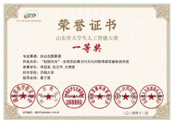 凭借不懈努力,李目笑连续两年荣获校一等奖学金,并获得济南大学本科生最高荣誉的国家奖学金,同时在学科竞赛与科技创新领域取得了系列突出成绩。在学科竞赛方面,两次拿下“睿抗机器人开发者大赛全国总决赛” 编程技能竞赛二等奖,2024年12月拿到全国大学生数字媒体科技作品及创意竞赛全国总决赛三等奖,2025年拿到第 21 届百度之星程序设计大赛初赛(人才专项赛道)金奖、第七届码蹄杯山东赛区金奖;在科技创新方面,“基于 YOLOv8 与 DLIB 的学生课堂行为分析系统” 成了省级重点项目,“校园方舟” 安全监测平台获山东省人工智能大赛一等奖,还发表了学术论文《YOLO-CS: A Lightweight Pedestrian Detection Model for Small Objects》。成功保研南开大学。