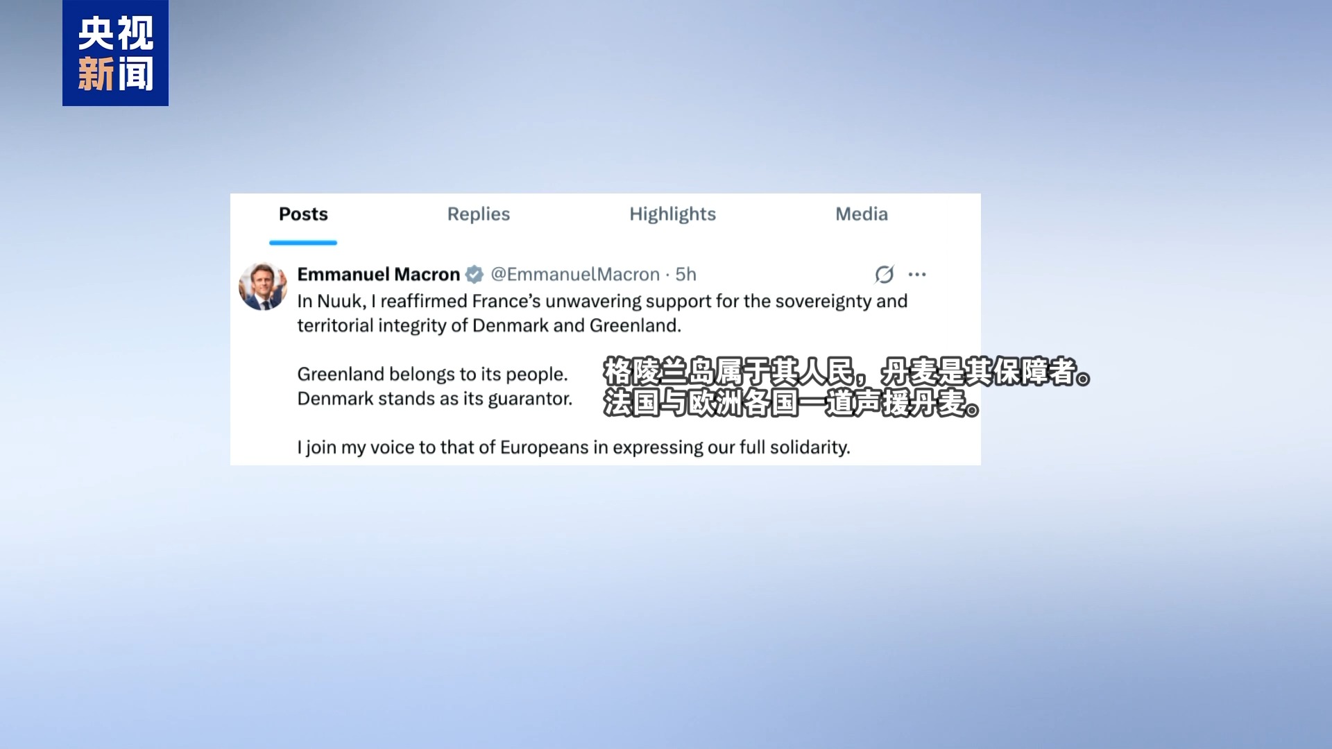 法国总统马克龙23日在社交媒体发文,重申法国坚定支持丹麦和格陵兰岛的主权与领土完整。