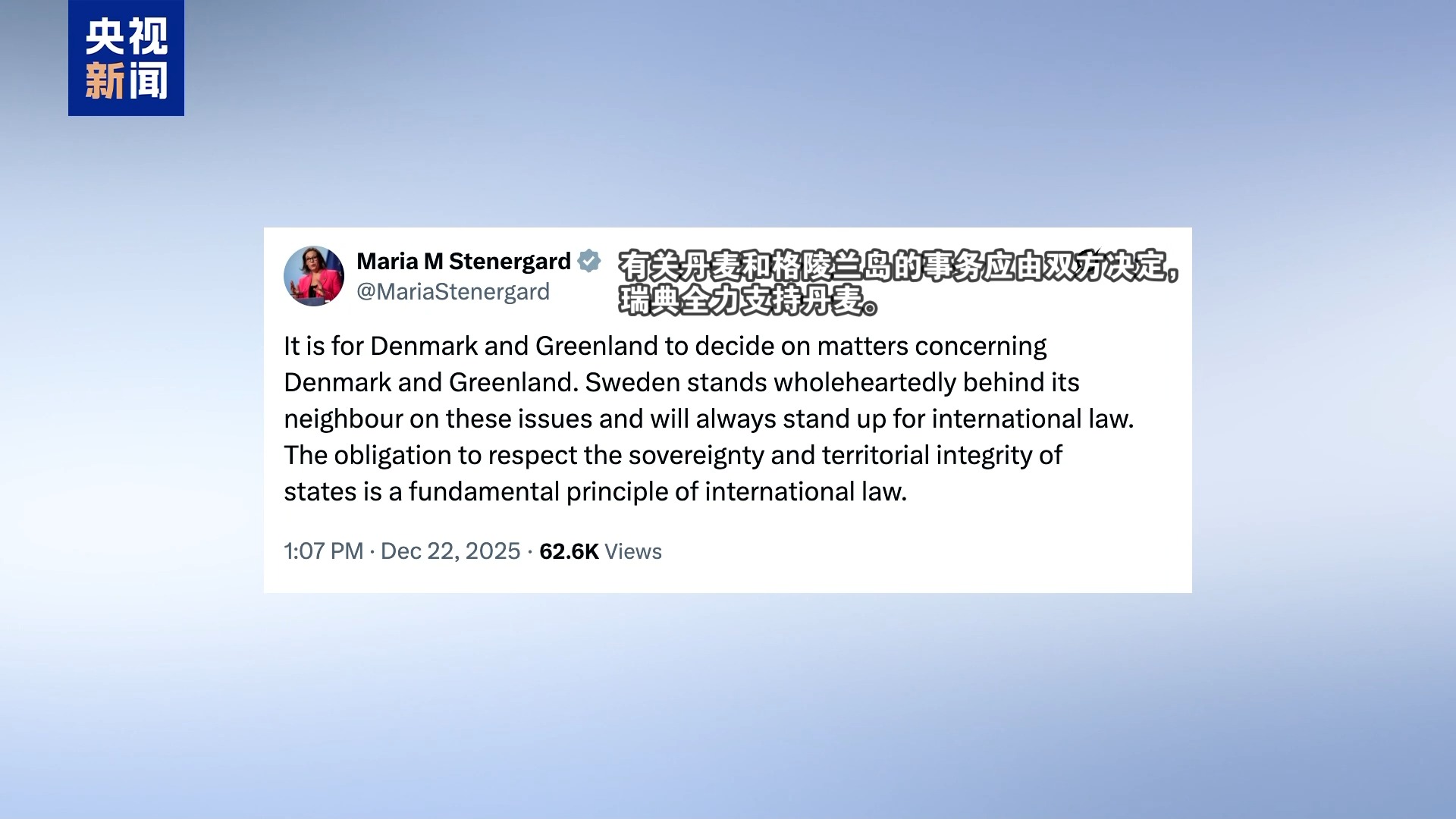 瑞典外交大臣玛丽亚·马尔默·斯蒂纳加德22日也表达了对丹麦的支持。她表示,有关丹麦和格陵兰岛的事务应由双方决定,瑞典全力支持丹麦。她强调,尊重国家主权和领土完整是国际法的基本原则。