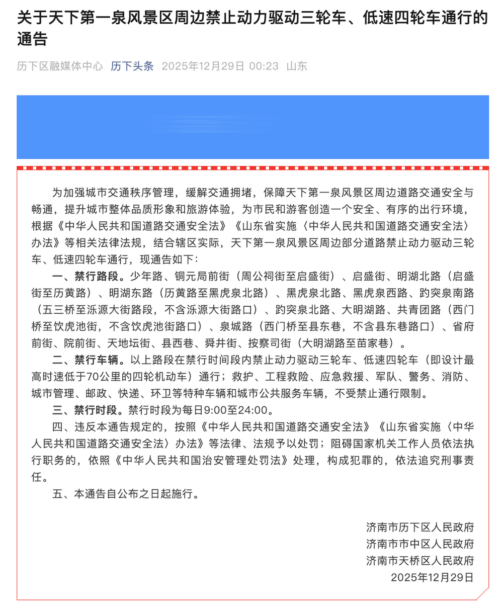 为加强城市交通秩序管理,缓解交通拥堵,保障天下第一泉风景区周边道路交通安全与畅通,提升城市整体品质形象和旅游体验,为市民和游客创造一个安全、有序的出行环境,根据《中华人民共和国道路交通安全法》《山东省实施〈中华人民共和国道路交通安全法〉办法》等相关法律法规,结合辖区实际,天下第一泉风景区周边部分道路禁止动力驱动三轮车、低速四轮车通行,现通告如下:
