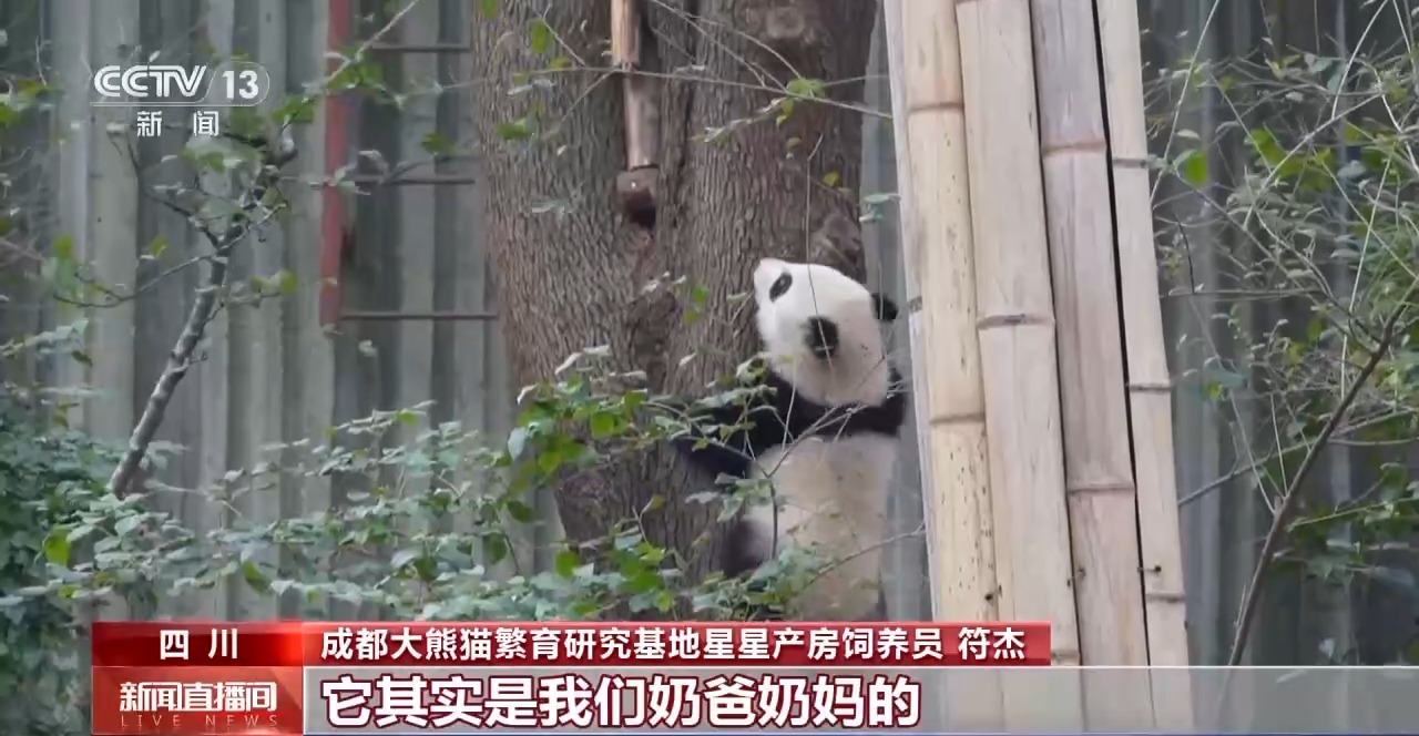 成都大熊猫繁育研究基地星星产房饲养员 符杰:另外一只在爬树的大熊猫是我们奶爸奶妈的一个“收猫”的小助手,比如其他的崽崽爬到树上下不来,它会爬到树杈上把小崽崽挤下来,然后帮我们把它收下来。