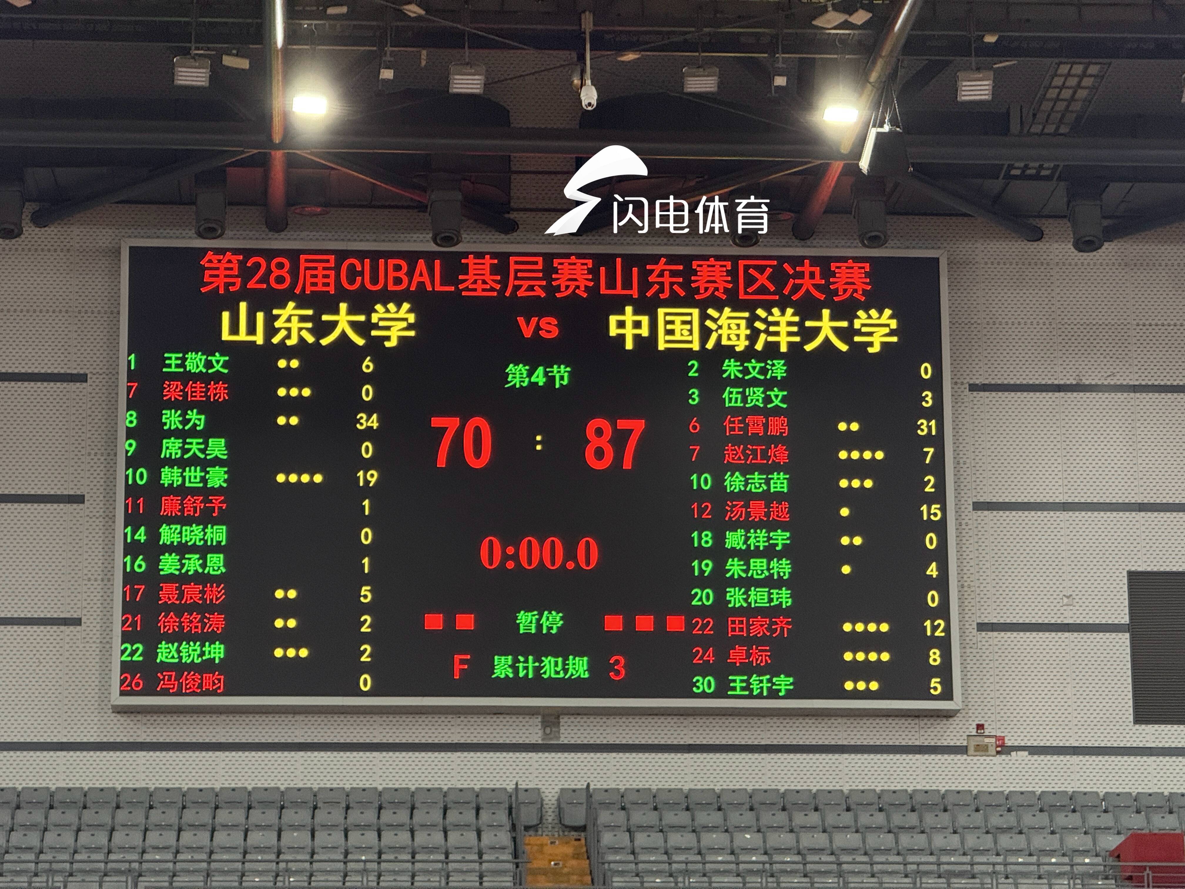 数据方面,中国海洋大学队共有三人得分上双,任霄鹏贡献31分、汤景越15分、田家齐12分。山东大学仅有两人得分上双,张为贡献34分,韩世豪砍下19分。