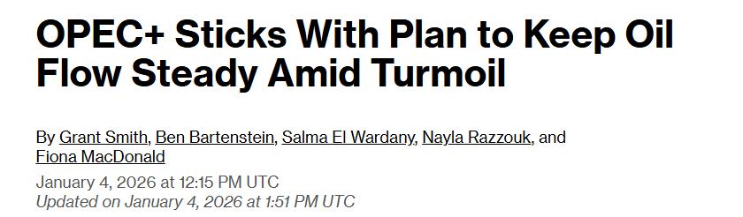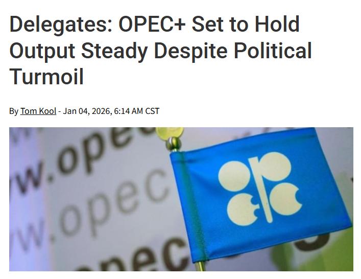 当地时间1月4日,欧佩克和非欧佩克产油国中的8个主要产油国(即欧佩克+)召开会议,决定维持2025年11月初制定的产量计划,在2026年2月和3月继续暂停增产。