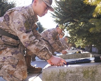 新兵户嘉琦在烈士王靖声墓前屈膝蹲下,轻轻拂去碑上积雪,仔细擦拭烈士英名。1952年5月25日,23岁的某团二大队大队长王靖声在战斗中为掩护战友,向敌双机攻击,壮烈牺牲。户嘉琦对记者说:“我来自狼牙山五壮士跳崖所在地,入伍前我特意又去了一次五壮士跳崖处。只要祖国需要,我会像五壮士和王靖声烈士一样,毫不犹豫地献出生命。”