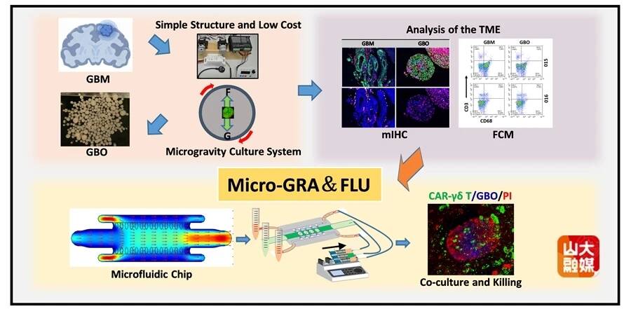 针对这一困境,团队创新性地将“微重力”与“微流控”技术相结合,研发出“Micro-GRA&FLU”平台,成功构建“迷你GBM微环境”。其中,微重力培养系统培育的肿瘤类器官(GBO),完整保留了原肿瘤的异质性与免疫微环境;微流控芯片则通过模拟体内微血管环境,让CAR-γδ T细胞可自主迁移至肿瘤附近,实现对免疫细胞疗效的精准评价。该平台能为患者筛选个性化治疗方案,有效避免“一刀切”的治疗误区。