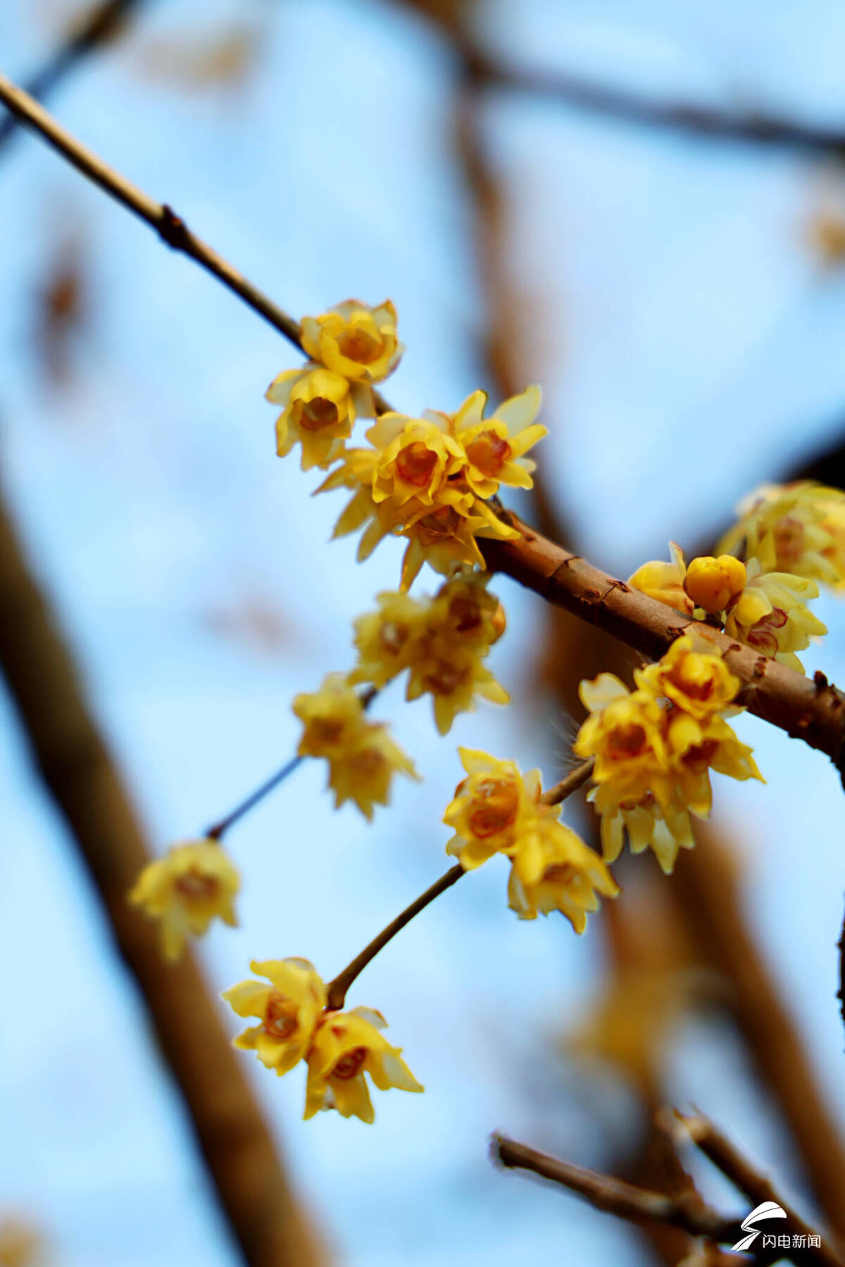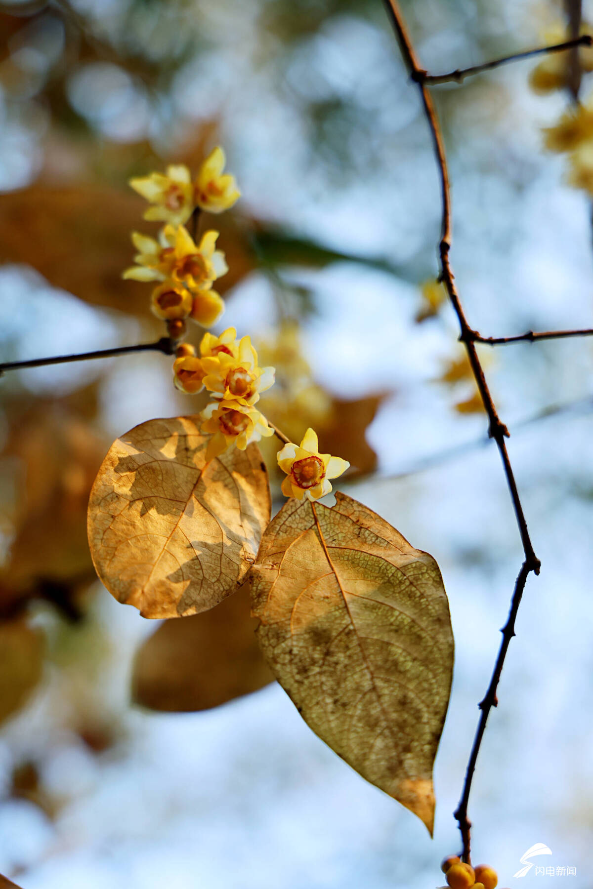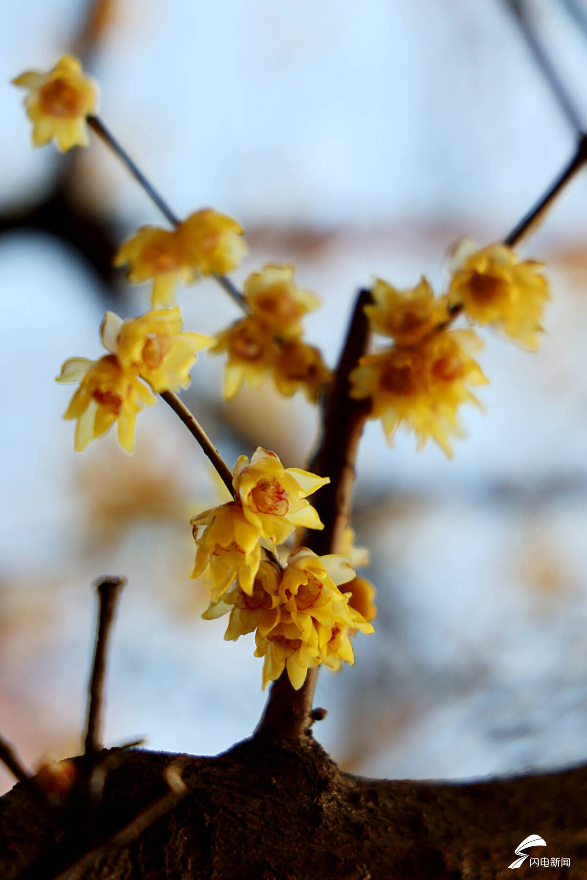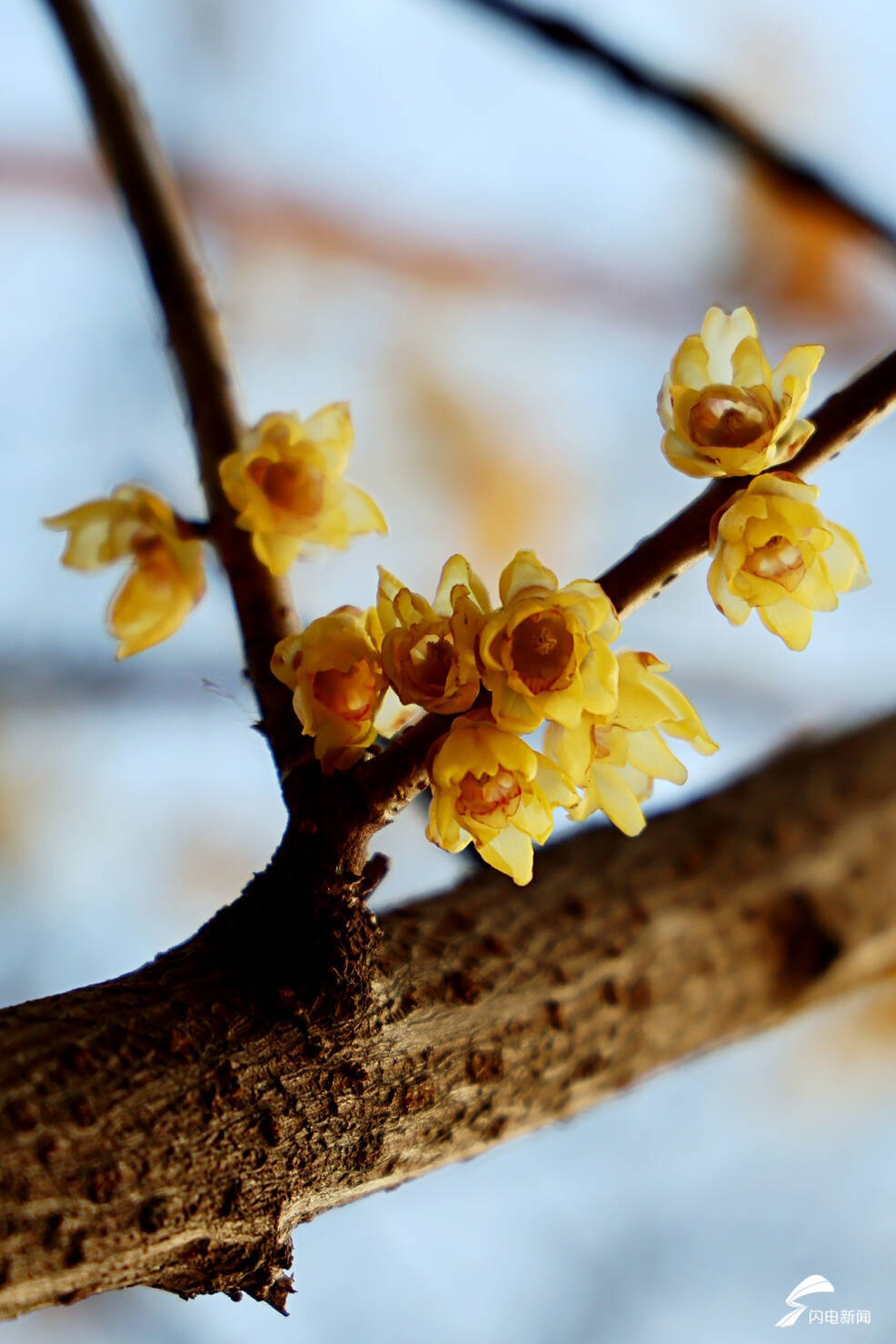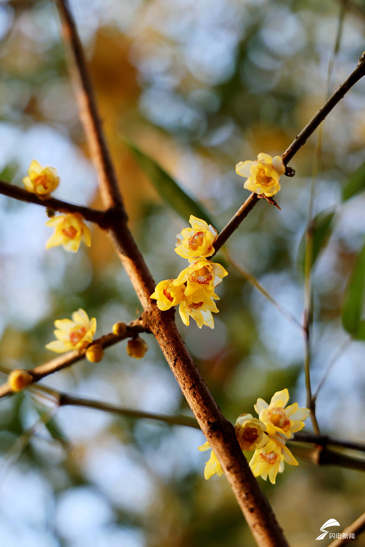 金黄的腊梅远远望去,满枝金黄如繁星点缀,在冷风中熠熠生辉。凑近细赏,层层叠叠的蜡质花瓣细腻精致,淡淡的幽香沁人心脾,越是天寒地冻,它开得越是热烈灿烂。