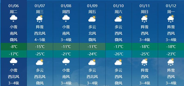 大城市中,哈尔滨今天最高气温将在-8℃,明天受冷空气影响将跌至-15℃,后天回升至-11℃,但周末将再跌到-17至-18℃,气温变化频繁。