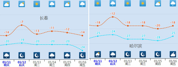 东北地区冷空气频繁影响,且降雪也比较频繁,今后7天气温总体较常年同期偏低,三九严寒本色尽显。像长春,明起6天有5天最高气温都在-10℃以下,哈尔滨最高气温也大多维持在-18℃上下。