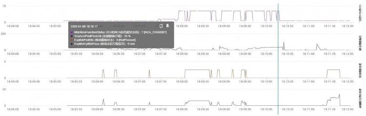 根据对用户授权的车辆数据进行分析,结果表明:事故发生前和事故发生时,车辆始终处于【NCA_STANDBY】状态,即辅助驾驶功能未激活。碰撞发生后,安全气囊等正常打开。