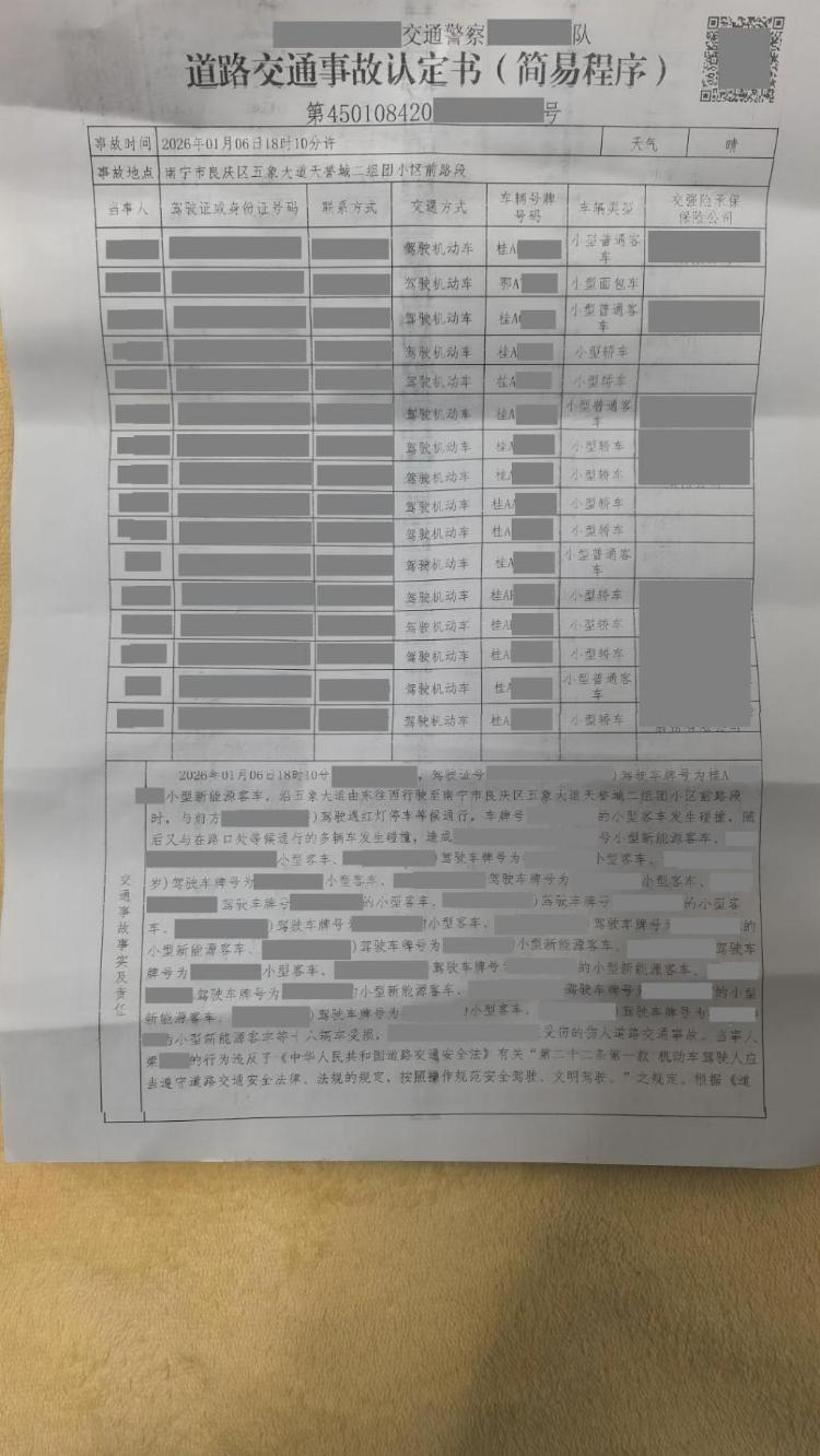 1月6日,一辆阿维塔07在广西南宁因超速驾驶连续与15辆车发生碰撞,当地交警已做现场调查处理,并出具事故认定书,明确事故原因为驾驶员导致。