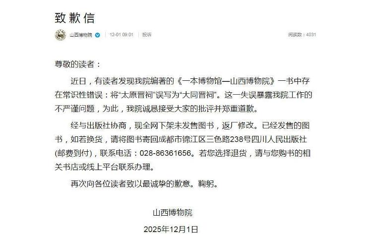 12月1日,@山西博物院 发布致歉信: