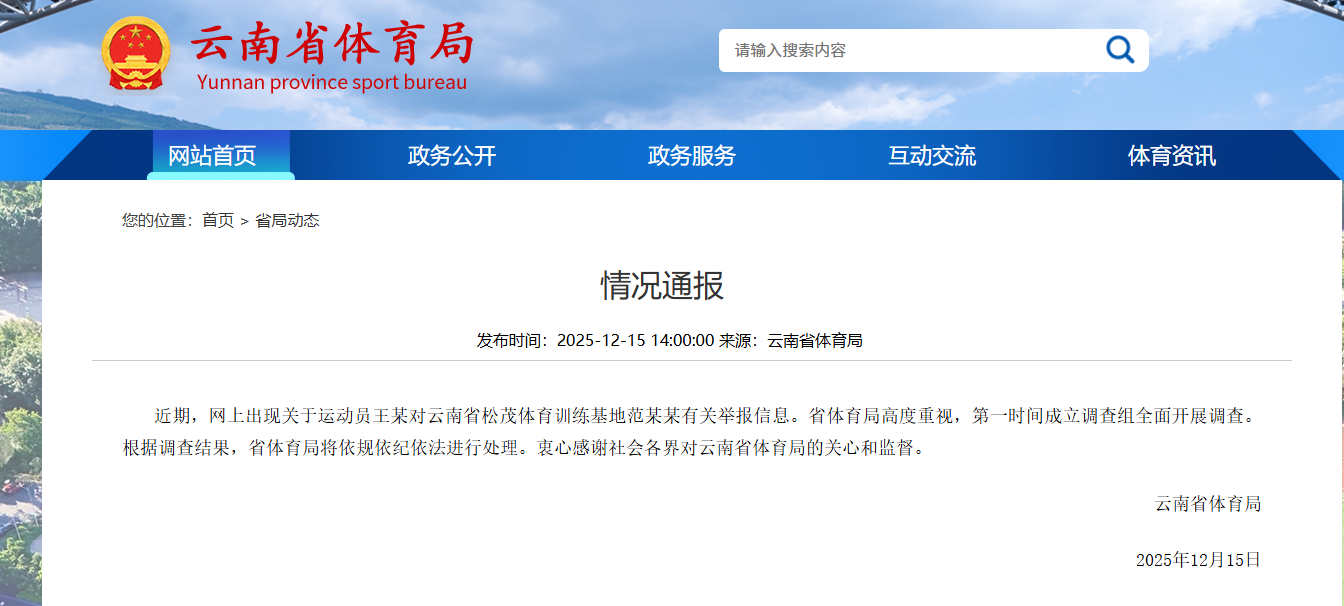 12月15日,云南省体育局发布情况通报:近期,网上出现关于运动员王某对云南省松茂体育训练基地范某某有关举报信息。云南省体育局高度重视,第一时间成立调查组全面开展调查。根据调查结果,云南省体育局将依规依纪依法进行处理。
