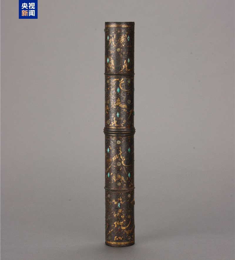 △西汉错金银镶松石狩猎纹铜伞铤,河北省文物考古研究院藏。