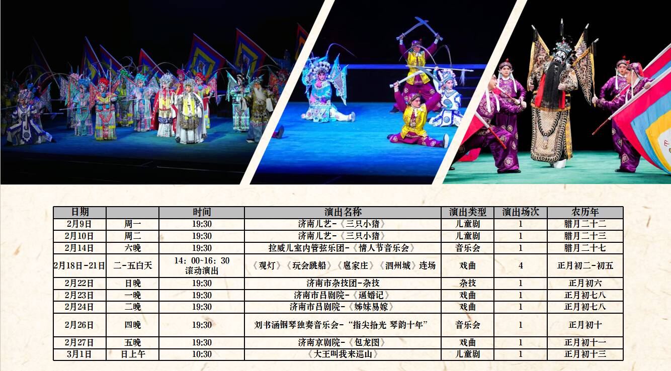 春季演出季内容丰富,涵盖儿童剧《三只小猪》(2月9日-10日)、情人节音乐会(2月14日)、戏曲连台《观灯》《玩会跳船》等(2月18日-21日,免费)、杂技(2月22日)、吕剧《逼婚记》《姊妹易嫁》(2月23日-24日)、京剧《包龙图》(2月27日)等多类型演出,提供高品质剧场艺术享受。